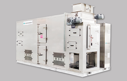 德爾科自主創新研發設計制造的污泥干化機,利用制冷系統的低溫熱泵除濕原理,將來自干燥室的濕空氣降溫脫濕,同時回收水分凝結的潛熱再次加熱干燥空氣,對網帶上的濕污泥進行脫水干化。設備全密閉式新穎設計,箱體內干燥熱風無熱損,干燥過程中實現能量的循環利用,實現